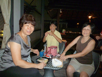 Lai Yoke serving the various types of cheese (specially brought to Singapore from France by Hugo's family) she brought for the party; assisted by Poh Choo with Chiu Ngor waiting to have a taste of it.